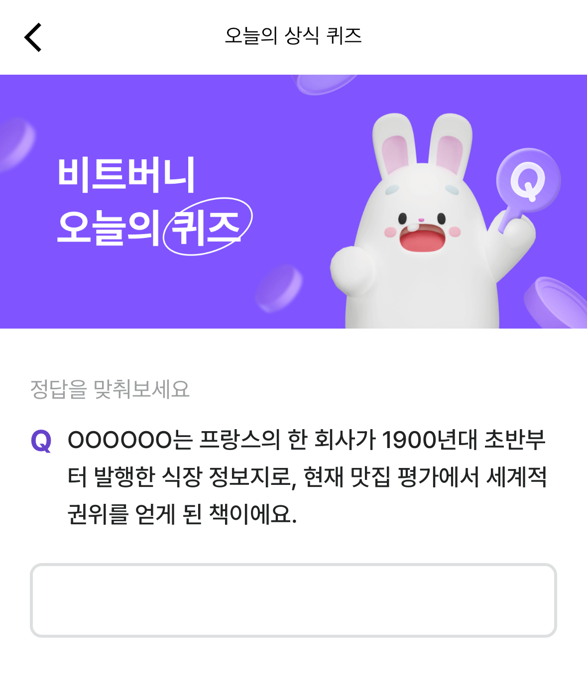 Q. ㅇㅇㅇㅇㅇㅇ는 프랑스의 한 회사가 1900년대 초반부터 발행한 식장 정보지로, 현재 맛집 평가에서 세계적 권위를 얻게 된 책이에요.