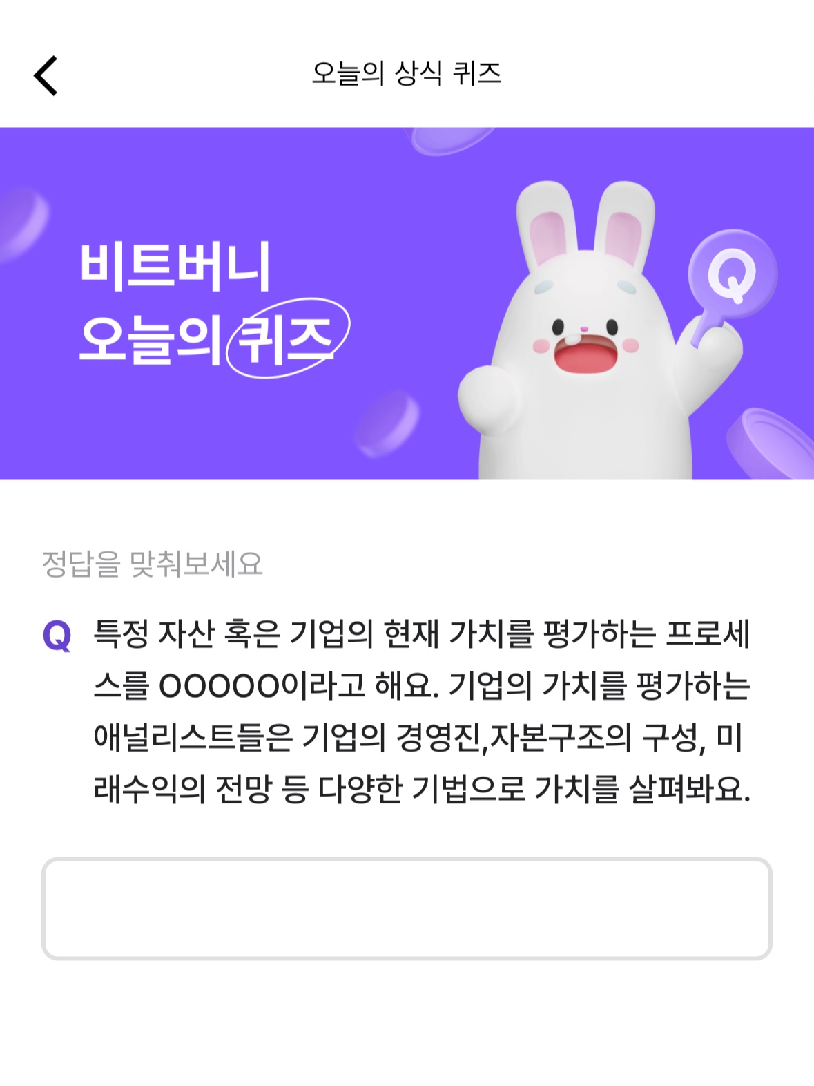 Q. 특정 자산 혹은 기업의 현재 가치를 평가하는 프로세스를 ㅇㅇㅇㅇㅇ이라고 해요. 기업의 가치를 평가하는 애널리스트들은 기업의 경영진, 자본구조의 구성, 미래수익의 전망 등 다양한 기법으로 가치를 살펴봐요.